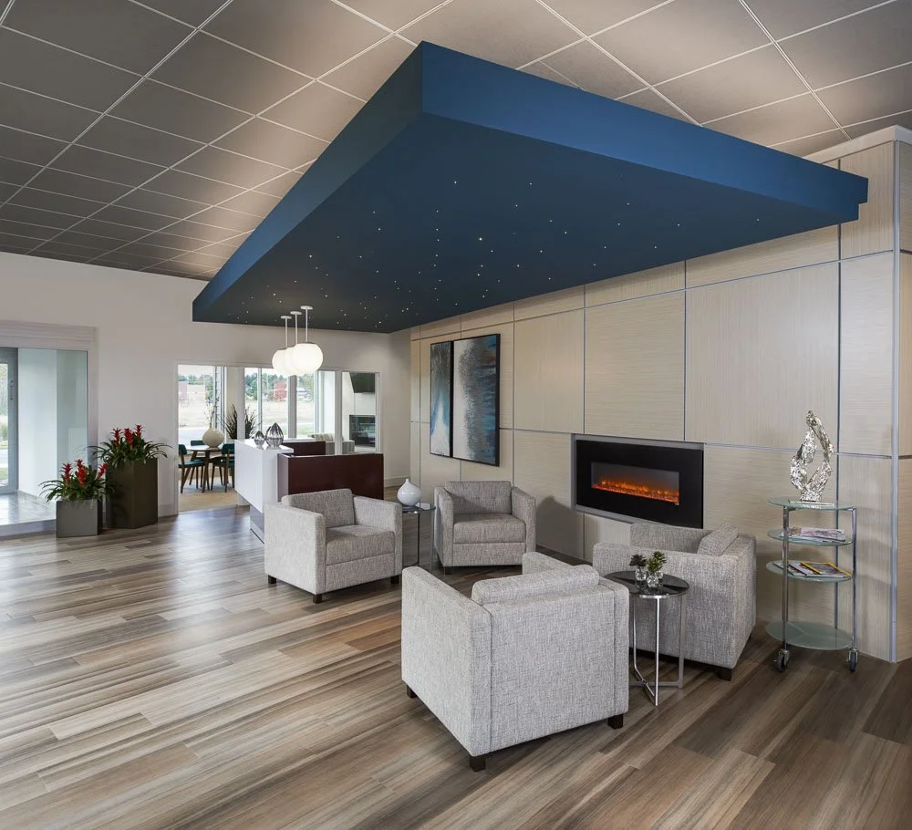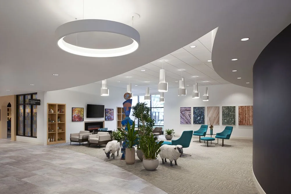 From arrival at the main entry through registration, the interior environment designed using the resort model can transform both the image of a rehabilitation facility and the resident’s experience during their stay. The analogy between rehab and resort is strong when you acknowledge the parallels. Guests check in, stay in a guest room, schedule therapies, relax in gardens, and go to cafés and dining rooms. Guests are on property for a week or two and return home, feeling invigorated. The Resort Model provides spa services, a hair salon, massage therapy, a coffee house and lounge, outdoor gardens and terraces with views to nature, all in addition to physical and occupational therapy suites.