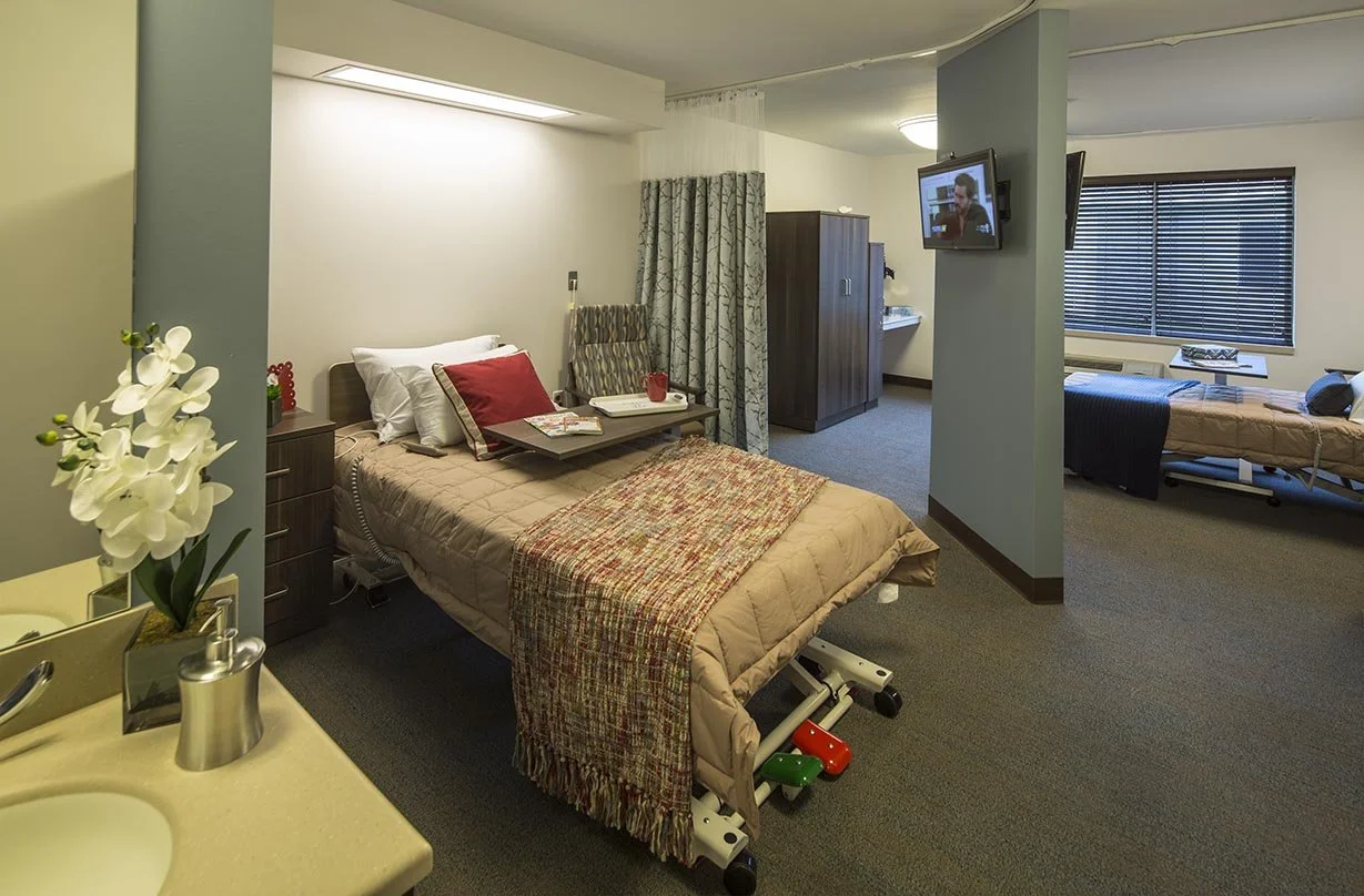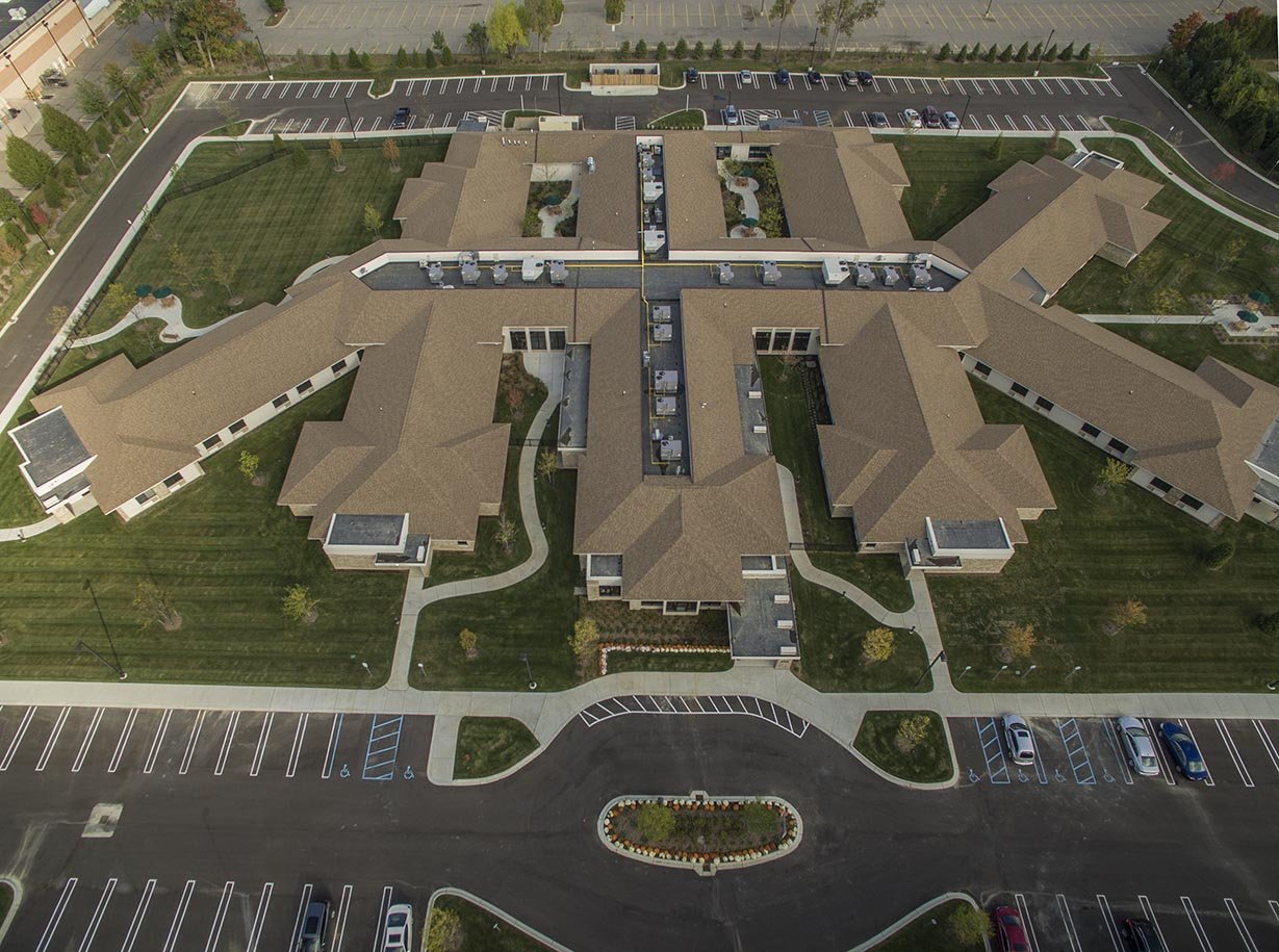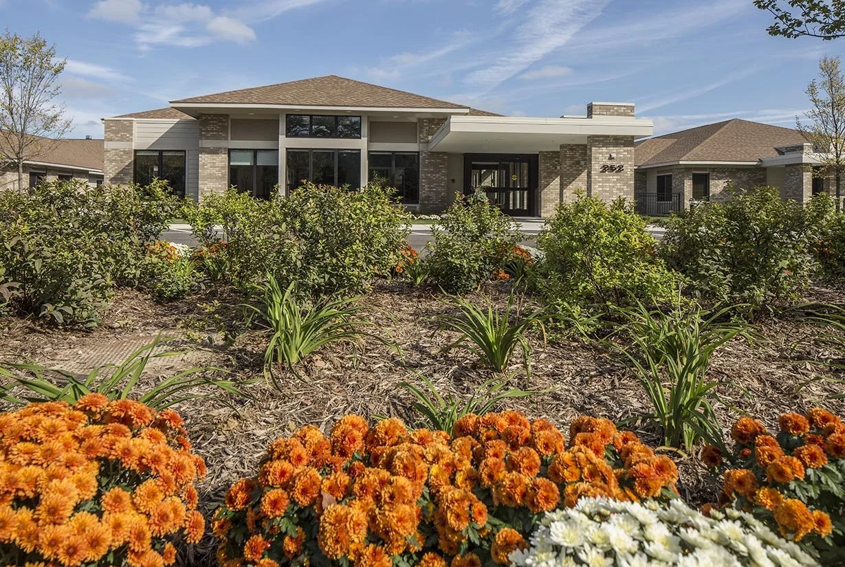 Nestled into a 10-acre suburban site, this facility looks to Prairie School design motifs and an organic interior palette to reflect a caring environment. Strong tans and muted reds are a recurring thematic element, from the architecture and wall coverings to the art and furniture. The bistro has a fully operational Starbucks alongside serving areas. This large central bistro space serves as the hub of activity throughout the day, with quiet lounges and day spaces tucked further into wings near resident corridors. Although resident rooms are predominantly private, innovative layouts were implemented with the semi-private rooms in order to maximize privacy while allowing views to the outdoors from each bed. The facility is currently 100 beds, although the site and building layouts allow for one additional wing to be added in the future.